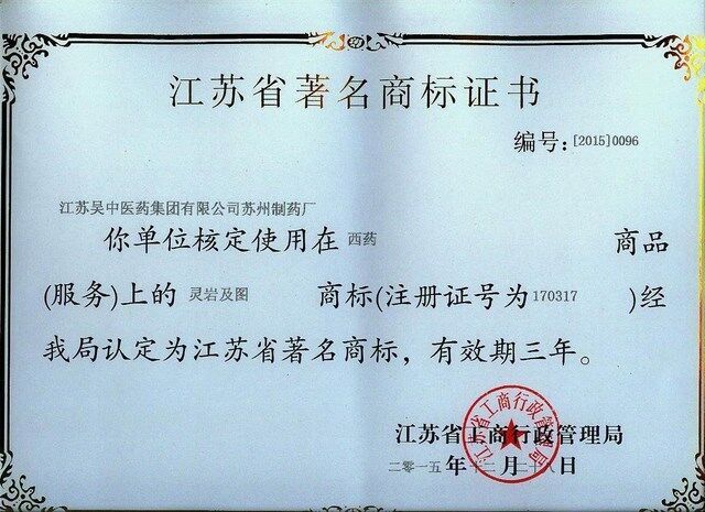 开云线上平台(集团)官方网站苏州制药厂的“灵岩及图”商标(注册号170317)被江苏省工商行政管理局认定为江苏省著名商标。