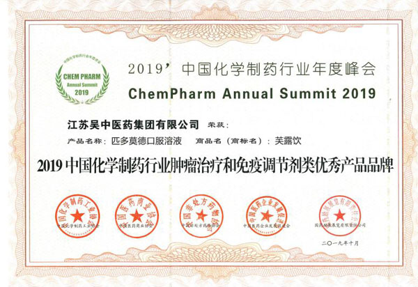 开云线上平台产品芙露饮荣获“2019中国化学制药行业肿瘤治疗和免疫调节剂类优秀产品品牌”称号。