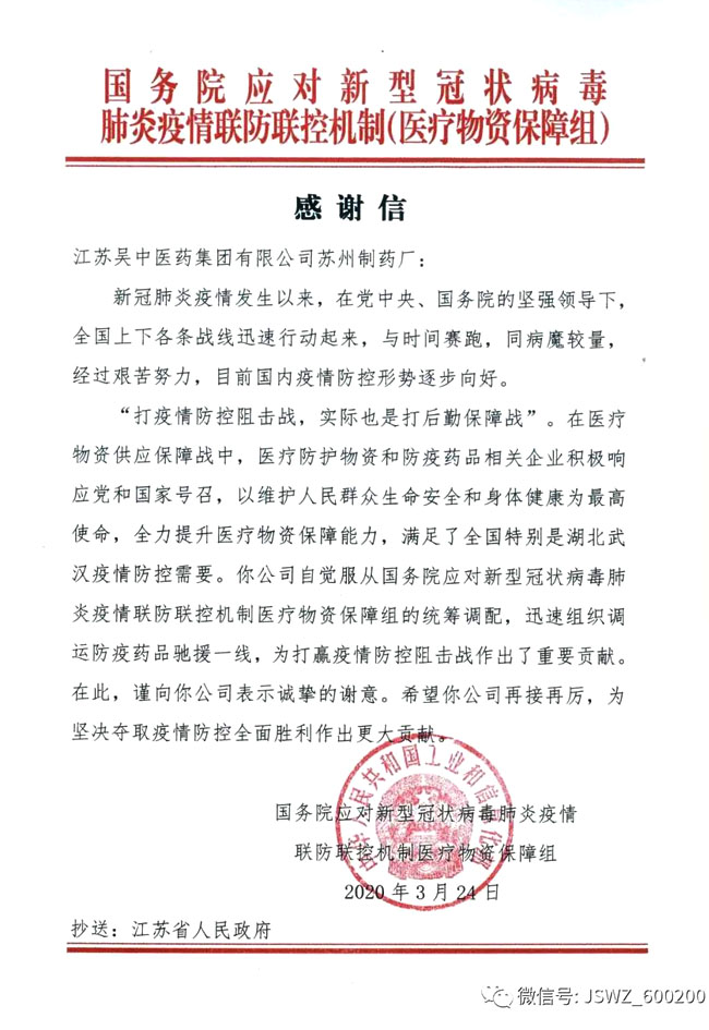 近日,公司下属苏州制药厂收到国务院应对新冠疫情联防联控机制(医疗物资保障组)发来的感谢信。