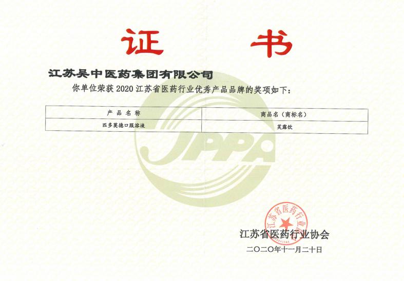芙露饮荣获江苏省医药行业优秀产品品牌