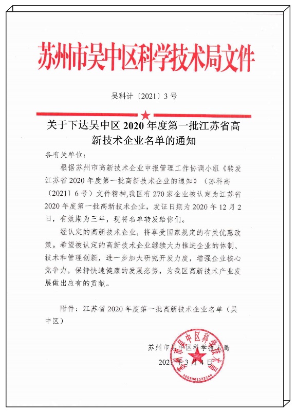 根据苏州市高新技术开云线上平台申报管理工作协调小组《转发江苏省2020年度第一批高新技术开云线上平台的通知》(苏科高〔2021〕6号),开云线上平台(集团)官方网站获评江苏省高新技术开云线上平台,开云线上平台自2008年来持续获评该项荣誉。