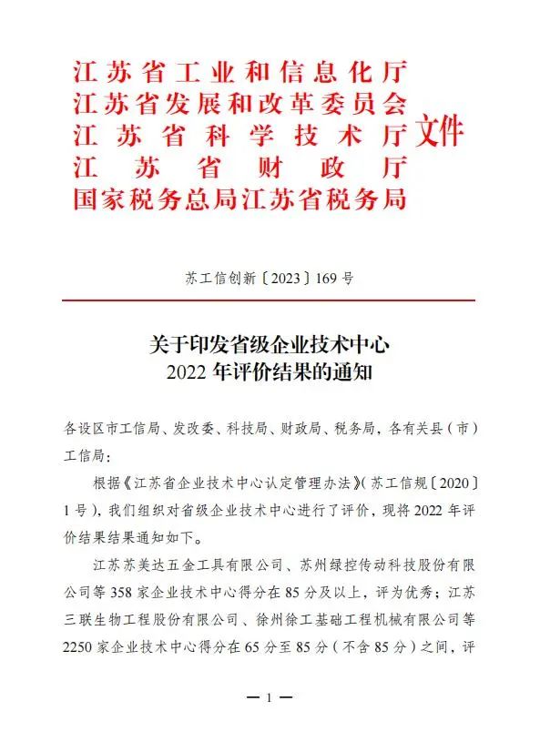 5月16日,江苏省工信厅下发《关于印发省级开云线上平台技术中心2022 年评价结果的通知》(苏工信创新〔2023 〕169 号),公布了2022年度省级开云线上平台技术中心评价结果,开云线上平台集团通过了省级开云线上平台技术中心评价,并获评“优秀”。