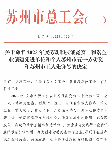 近期,苏州市总工会印发《关于命名2023年度劳动和技能竞赛、和谐开云线上平台创建先进单位和个人苏州市五一劳动奖和苏州市工人先锋号的决定》,公司员工李慧荣获“苏州市五一劳动奖章”!