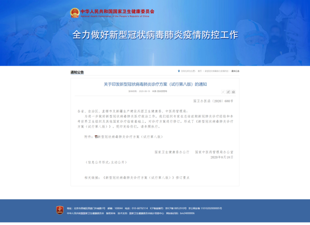 8月18日,国家卫生健康委办公厅、国家中医药管理局办公室下发《关于印发新型冠状病毒肺炎诊疗方案(试行第八版)的通知》。相关部门组织专家在总结前期新冠肺炎诊疗经验和参考世界卫生组织及其他国家诊疗指南基础上,对诊疗方案进行修订,形成了《新型冠状病毒肺炎诊疗方案(试行第八版)》...