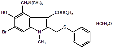 其化学名称:6-溴-4-(二甲氨基甲基)-5-羟基-1-甲基-2-(苯硫甲基)-1H-吲哚-3-羧酸乙酯盐酸盐一水合物。