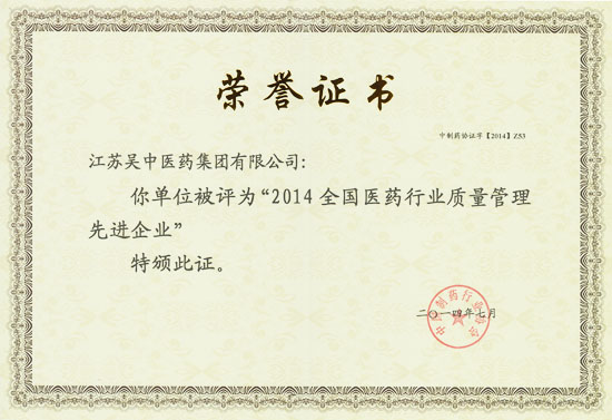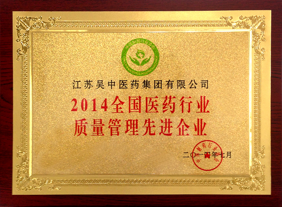 江苏开云线上平台集团荣获“2014年全国医药行业质量管理先进开云线上平台”