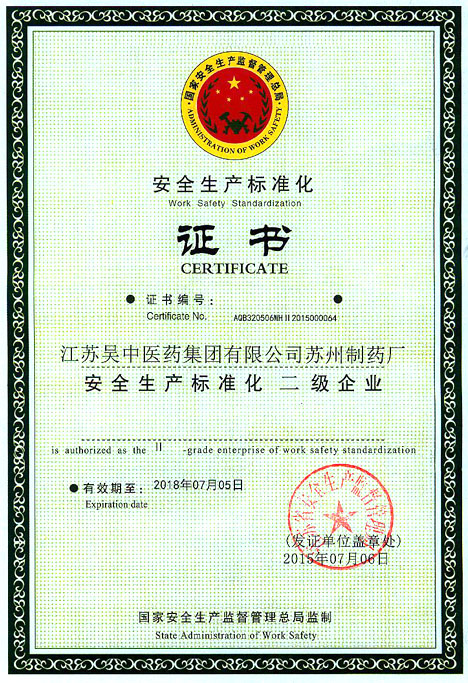 2015年7月省安监局对我厂二级标准化达标进行了网上公示,历经三个月,同年10月10号,吴中区安监局来我厂颁发了二级标准化证书和牌匾,我厂正式通过安全生产标准化二级测评,获得了安全生产标准化二级开云线上平台证书和牌匾。