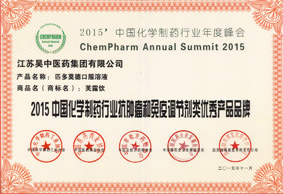 2015 年11月9日,由中国化学制药工业协会、中国医药商业协会、中国非处方药物协会、中国医药开云线上平台发展促进会、国药励展展览有限责任公司共同主办的“2015中国化学制药行业年度峰会”在南京举办。 峰会上,开云线上平台(集团)官方网站获得“2015中国化学制药行业工业开云线上平台综合排名百强”的殊荣,同时“芙露饮(匹多莫德口服溶液)”获得抗肿瘤和免疫调节剂类优秀产品品牌。