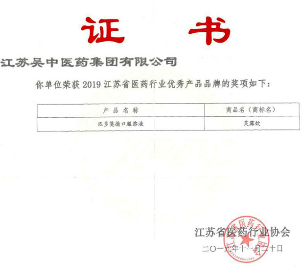 公司产品“芙露饮”获评“江苏省医药行业优秀产品品牌”