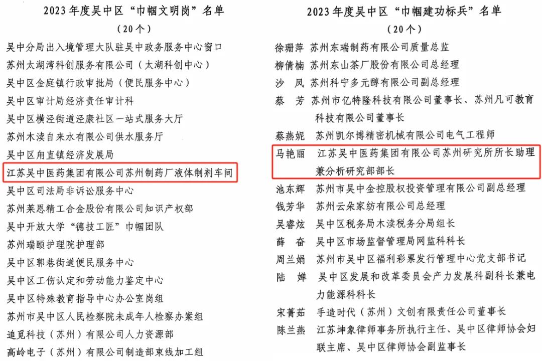 开云线上平台苏州制药厂液体制剂车间荣获2023年度吴中区“巾帼文明岗”称号,开云线上平台苏州研究所所长助理兼分析研究部部长马艳丽荣获2023年度吴中区“巾帼建功标兵”称号。