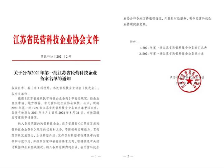 开云线上平台入选2021年第一批江苏省民营科技开云线上平台